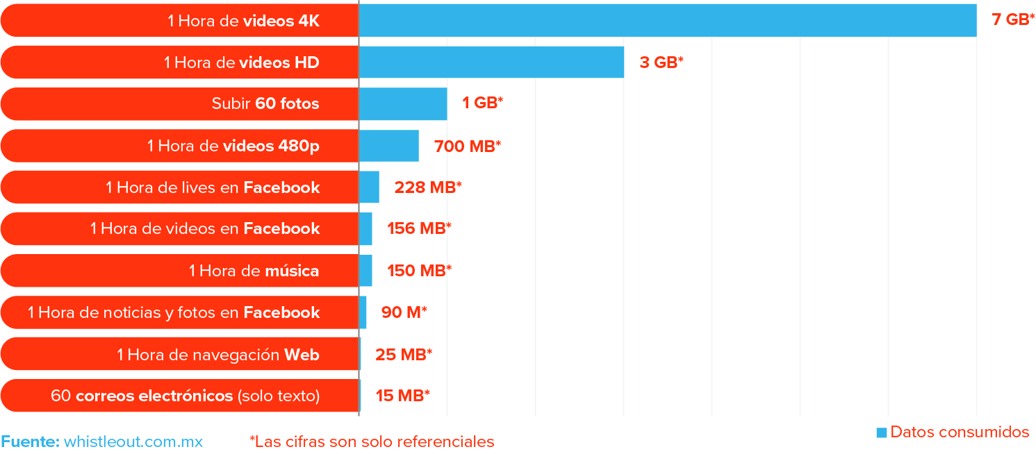 Los archivos de audio consumen datos de una forma más moderada; sin embargo, si escuchas una lista de reproducción automática el consumo dependerá de los minutos que te encuentres escuchando música. Por otro lado, los archivos de imagen consumen una baja cantidad de datos, siempre y cuando no estén en alta resolución. Por último, los sitios web que solo usan texto no tendrán un gran impacto en el consumo de datos.